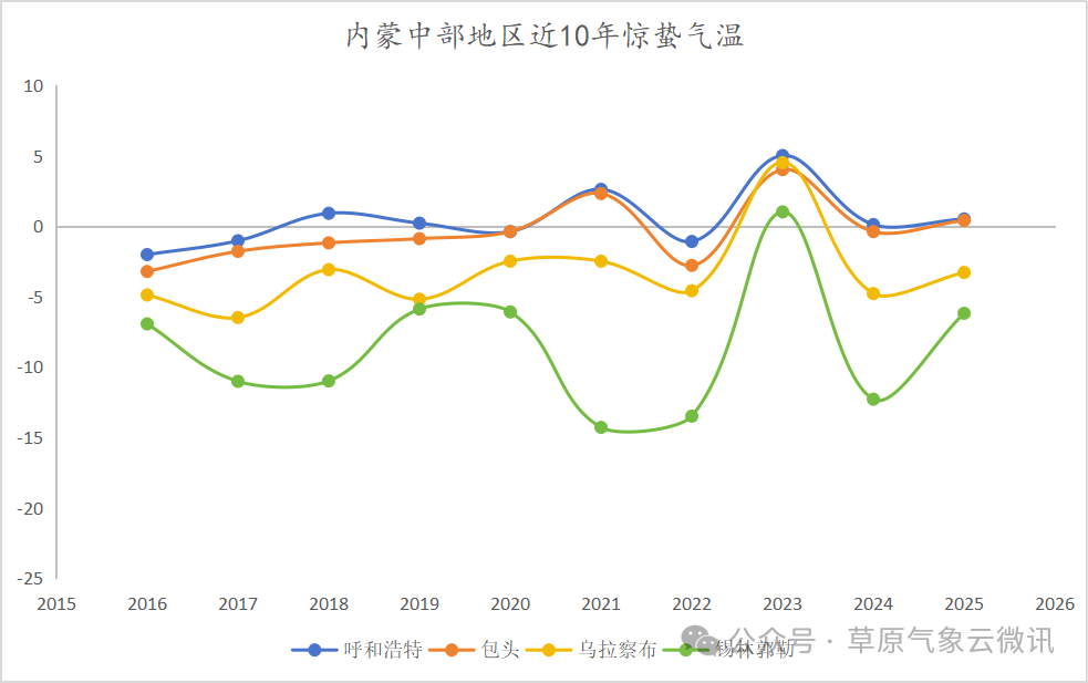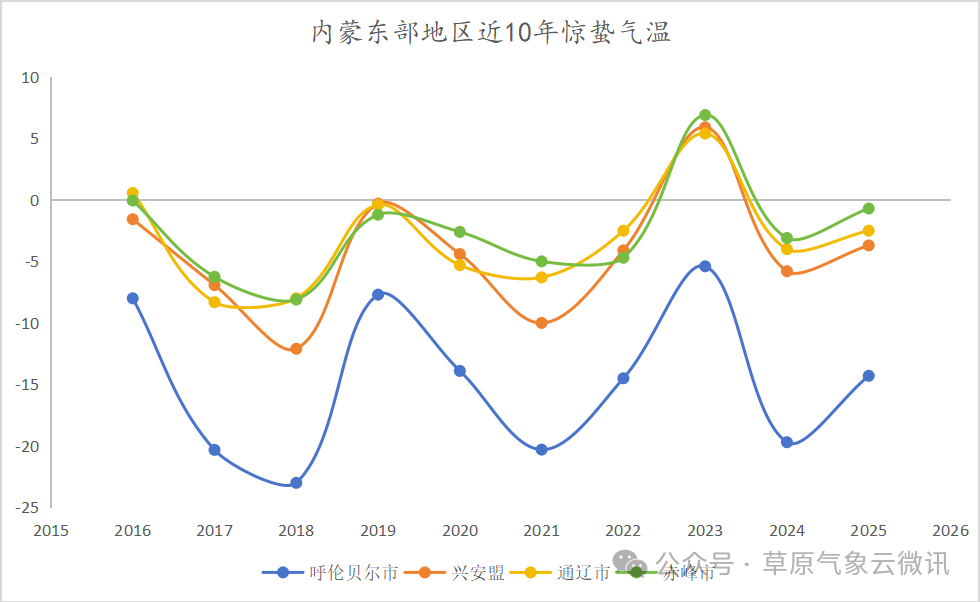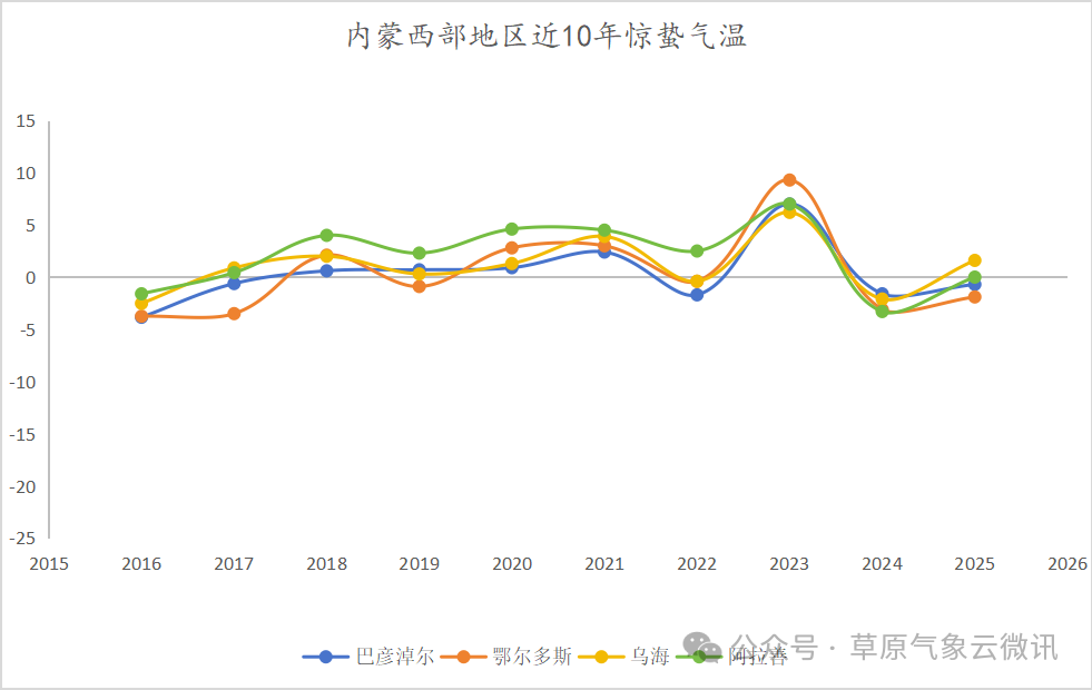 內(nèi)蒙古農(nóng)諺曰“驚蟄動了風(fēng),吹到五月中” ,“驚蟄刮北風(fēng),從頭另過冬”,在氣象上,北風(fēng)通常被視為冷空氣活動的標(biāo)志。驚蟄時節(jié)雖已入春,但冷暖空氣交替頻繁,刮北風(fēng)往往意味著冷空氣南下,這種冷空氣活動可能導(dǎo)致氣溫顯著下降,形成“倒春寒”(春季回暖后遇強(qiáng)冷空氣導(dǎo)致的低溫天氣)。所以驚蟄節(jié)氣,內(nèi)蒙古全區(qū)冷暖不一,東部仍然“貓冬”,數(shù)仔調(diào)取了最新歷史氣象數(shù)據(jù),帶你看看近十年驚蟄時節(jié)的內(nèi)蒙古全區(qū)氣溫差異之大。